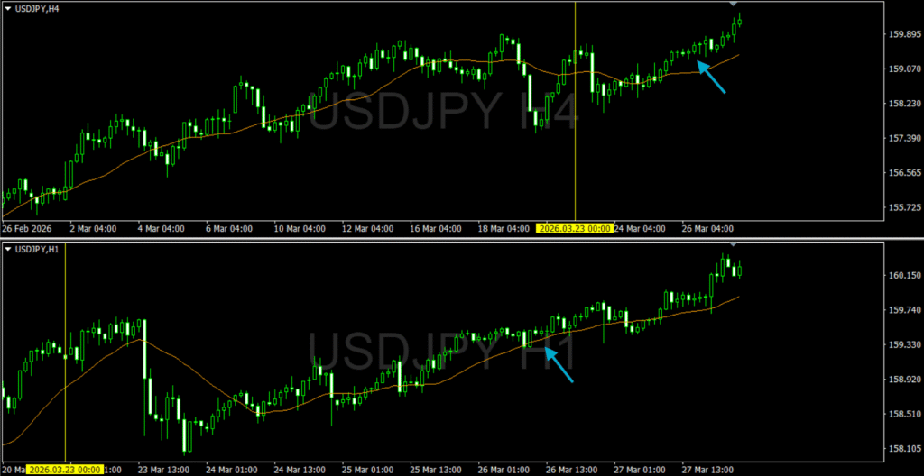 ・水色矢印箇所は押し目買いで狙えなくもないが、逆から一気で関わりづらい獲物だった。また、日足勢力が売り抑えてくる可能性もあり、積極的に関わりたい場面ではなかった。