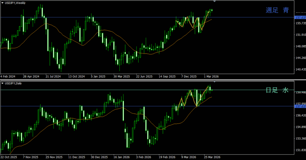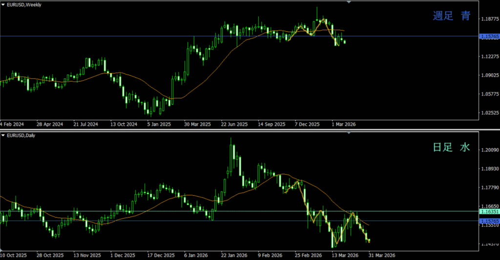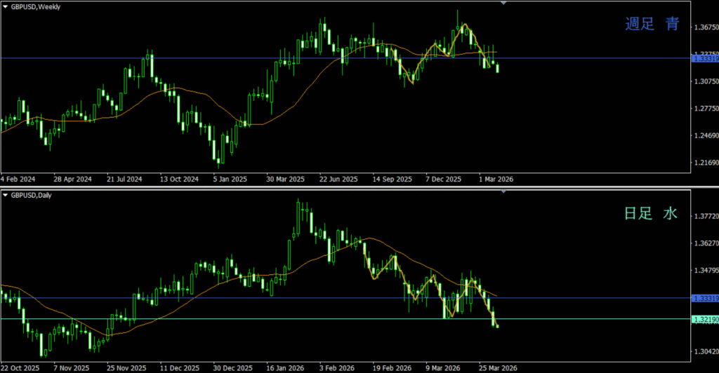 ・日足買い目線の勢力が少なくなったことで市場参加者はより売りを考えていそう。今週には日足前回安値圏までは到達しそう。