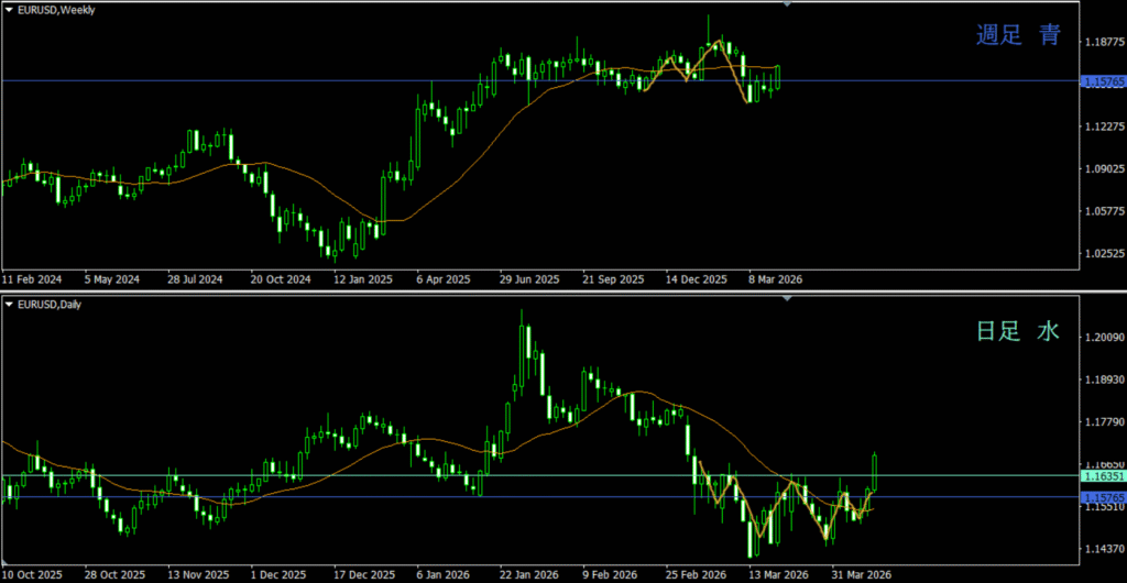 ・日足で下が2回止められた判定&月足勢力の影響で下が堅いと判断した市場参加者が買い資金を入れてきた可能性がある。長期的に買い優勢と判断する市場参加者も多そう