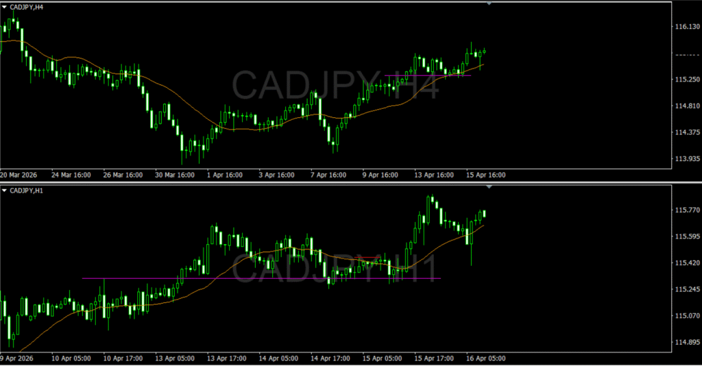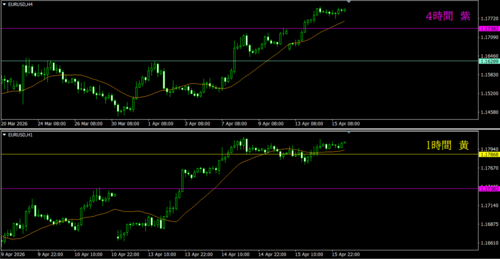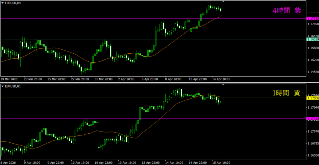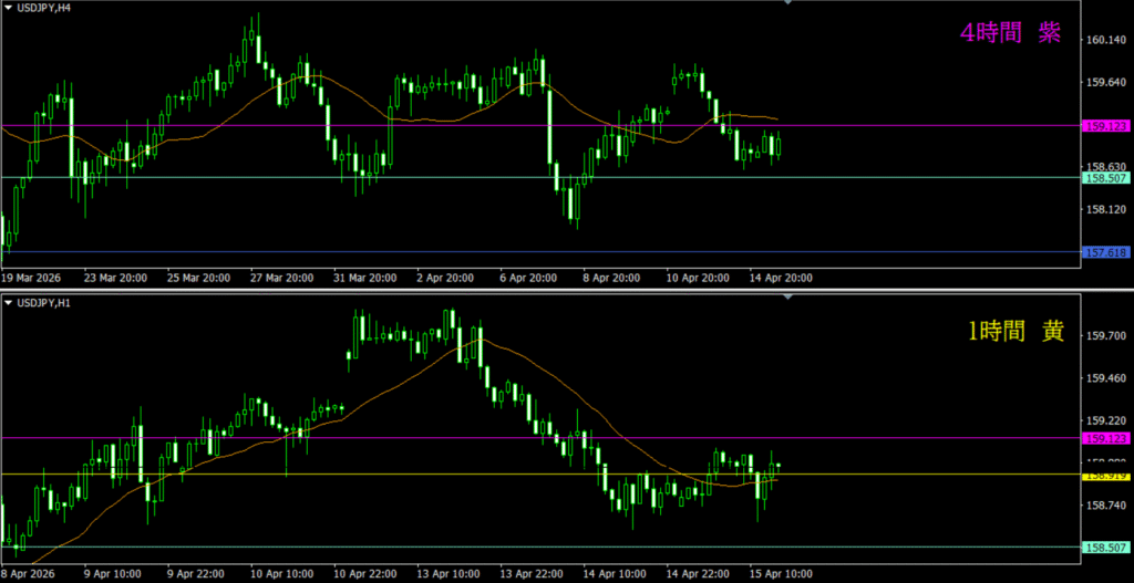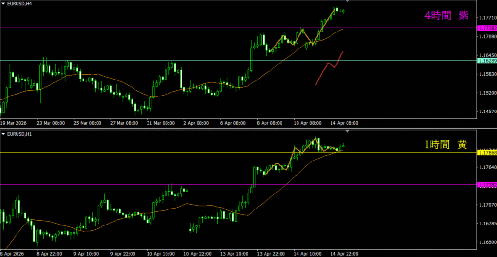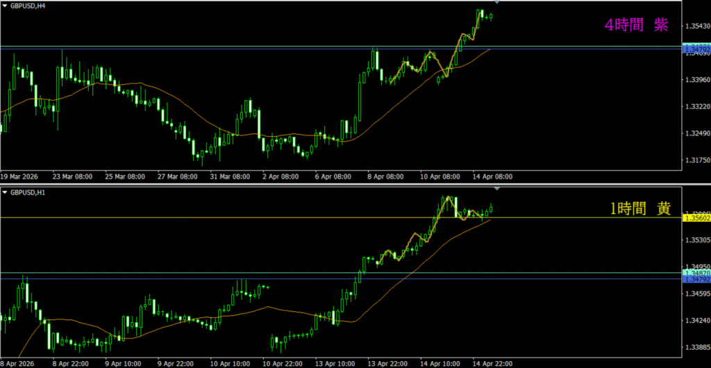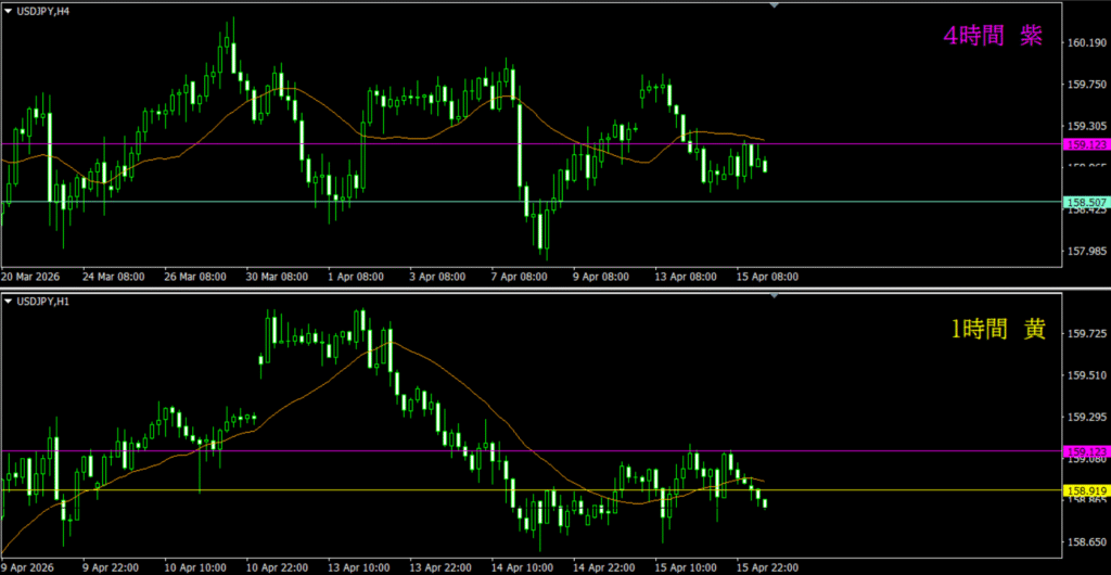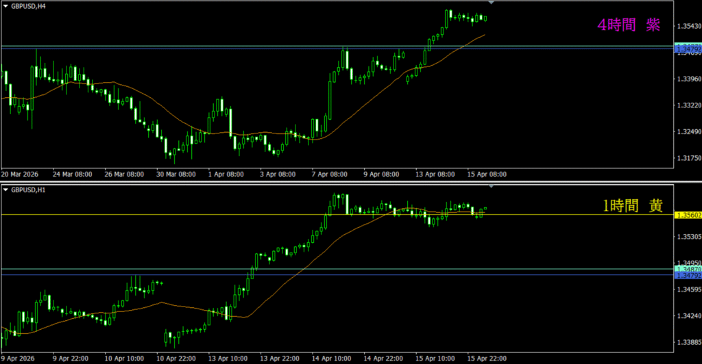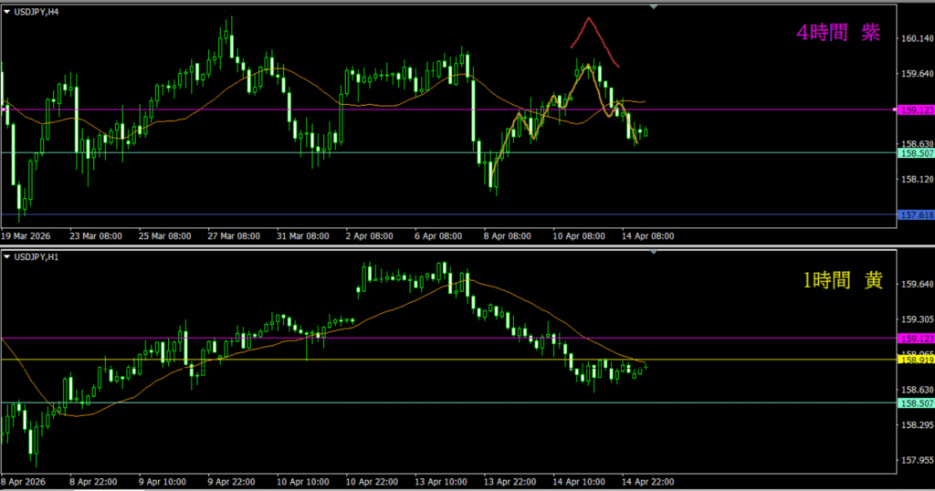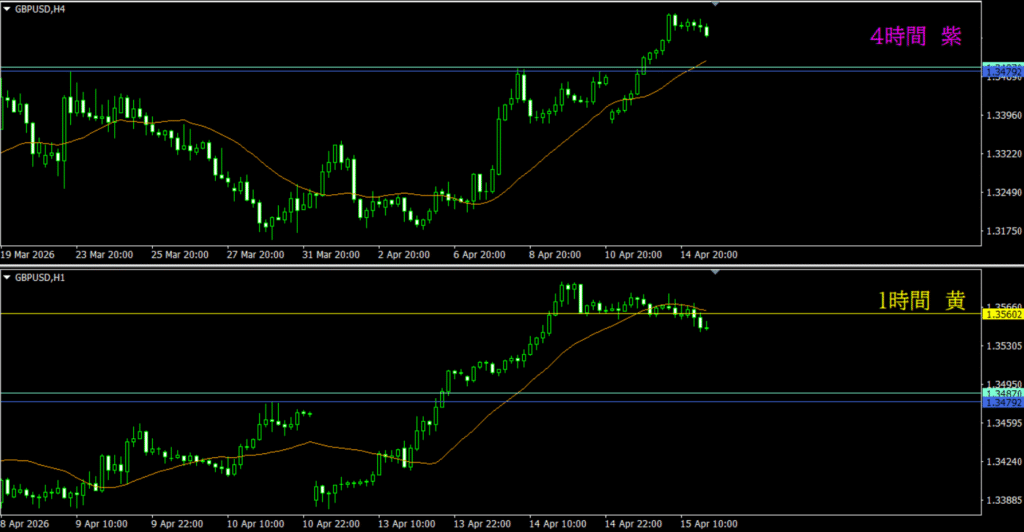 ・紫線に戻り売り勢力がいそう。どこにいるか少し分かりづらい。4時間MAでレジサポしているから、その付近に勢力がいると思う。