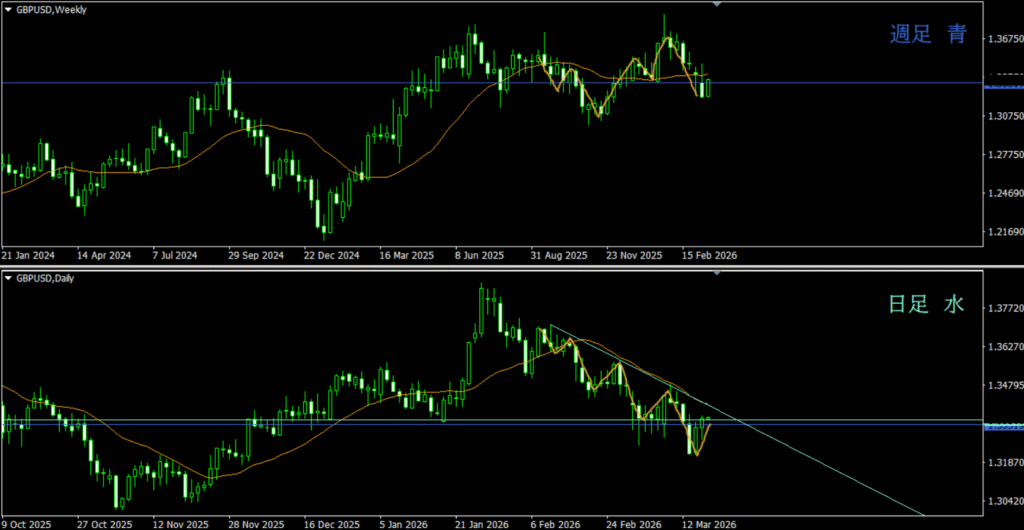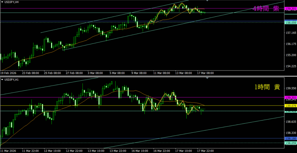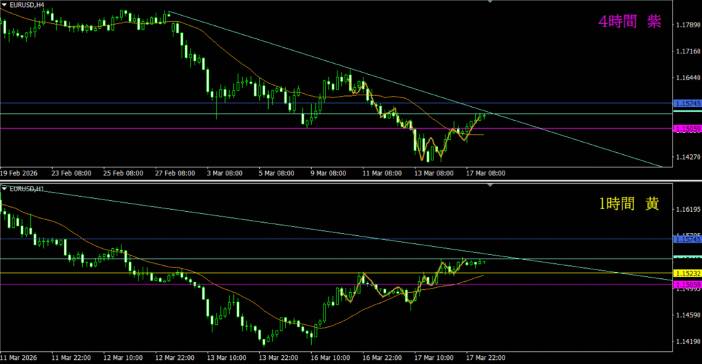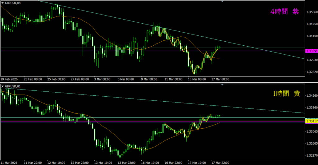 ・基本的には戻り売り目線だがここからは何も出来ない。また、懸念点は日足押し目買い勢力がいる可能性。日足のヒゲを入れるか折るかにもよるが、勢力がいることには変わりは無いから、そうなると警戒すべきで、直観的には売りたくない。ただ、日足MAの位置を加味すると水色点線まで下落する可能性もあるから、その場合は狙える値幅はある。
