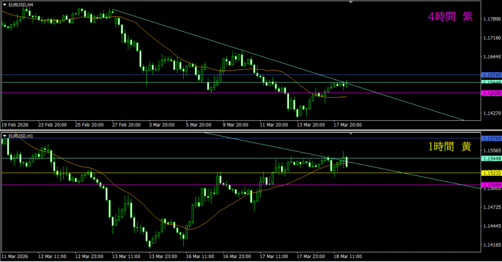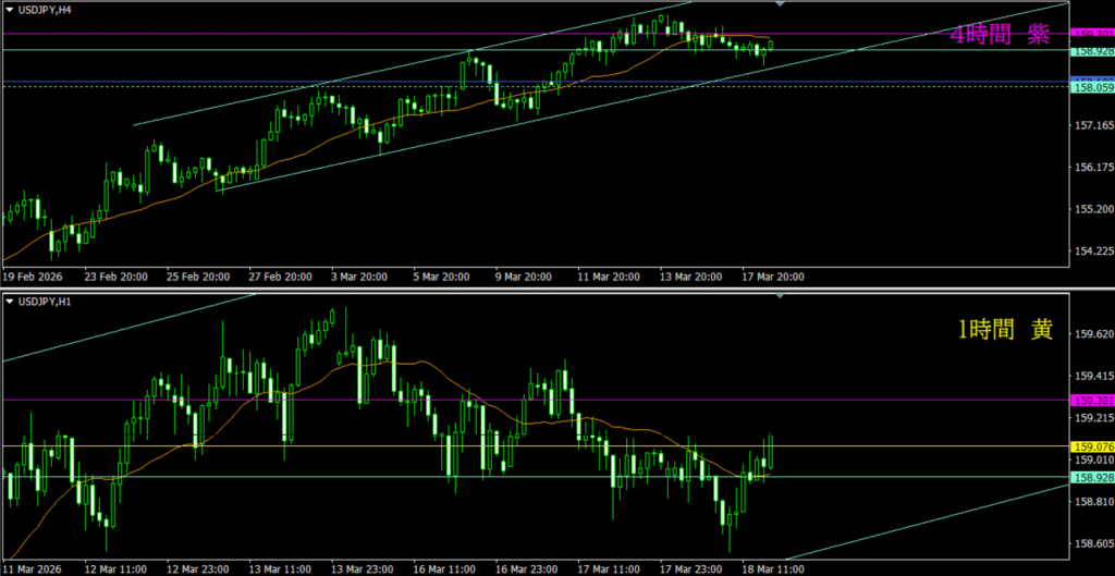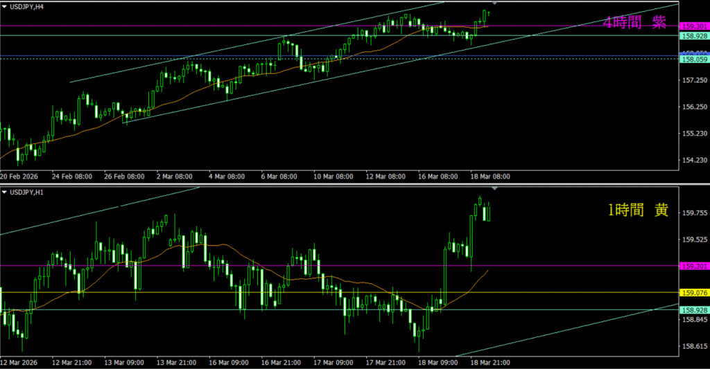 ・日足の方向が上になったこと、4時間でも下が堅い形になっていることから、資金を入れてきてもおかしくない場面