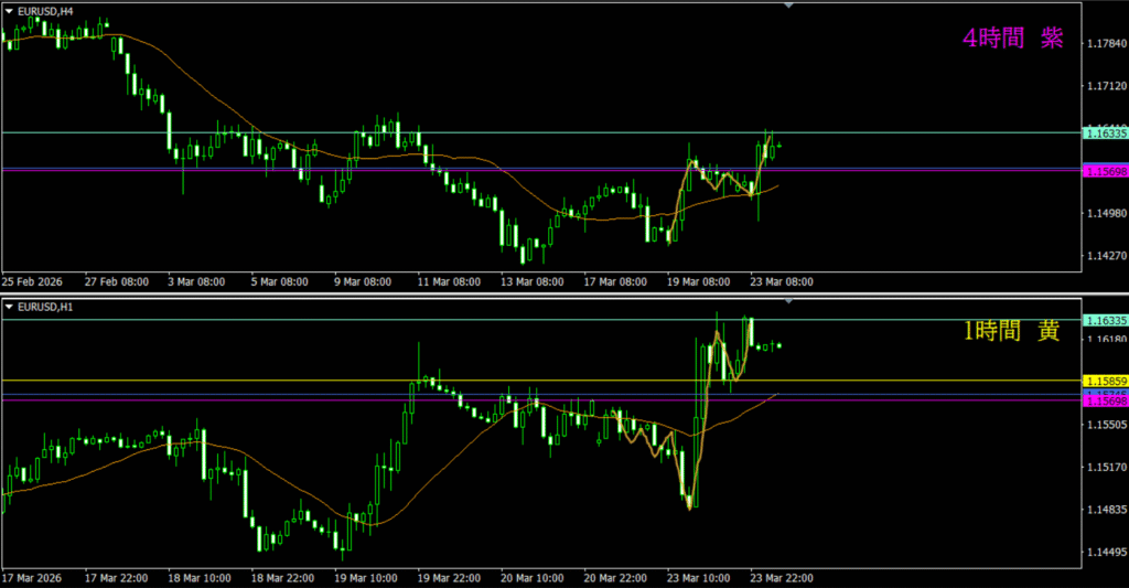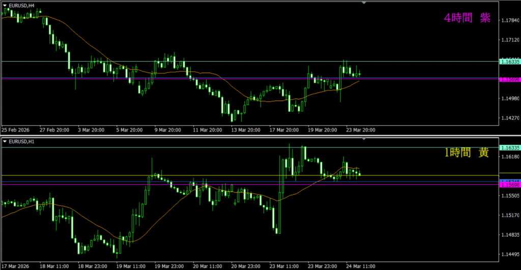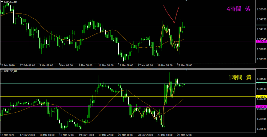 ・紫線に戻り売り勢力がいるのは分かるが、4時間DCが普段の感じではないから、積極的に狙いにいく場面ではないと思う